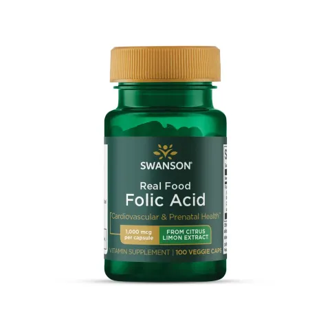 Real Food Folic Acid 1000mcg by Swanson is a dietary supplement in vegetable capsules made with extract folate from RGEN-FA® Citrus lemon.