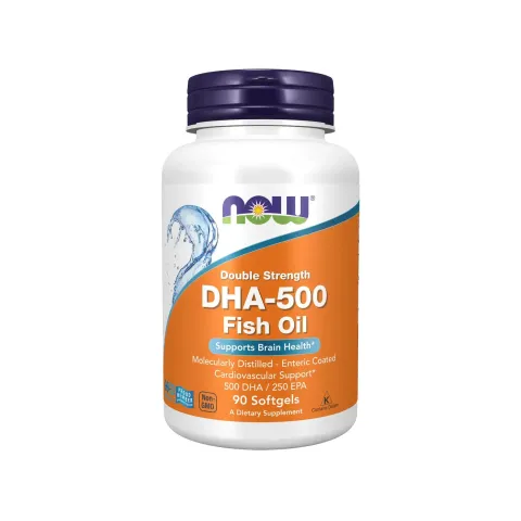DHA-500 de Now Foods est un complément alimentaire en softgel à base de concentré d’huile de poisson (EPA et DHA).