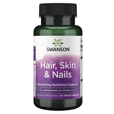 Cheveux, peau & ongles de Swanson est un complément alimentaire en comprimés qui contient des éléments comme la choline, le MSM, la queue de cheval, la L-cystéine, l’inositol et l’acide para-aminobenzoïque.