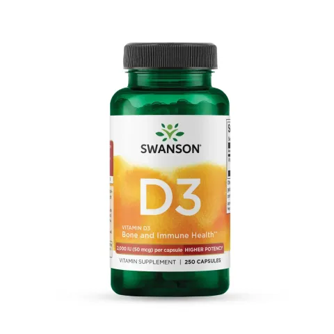 Vitamine D3 2000 UI de Swanson est un complément alimentaire en gélules à base de cholécalciférol (vitamine D3).